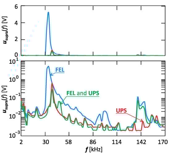 Amplitude–frequency characteristic for the selected time moment at the measurement point P6, when there is a supraharmonics source in the power grid as only FEL, only UPS, or both FEL and UPS—linear scale at the top, logarithmic scale at the bottom.