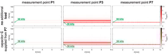Spectrograms of supraharmonics of phase voltages in the bandwidth 10–170 at measurement points P1, P3, and P7—supraharmonics generated by FEL supplied from network point P3, and UPS supplied from network point P6; capacitor C connected or not connected to network point P7.