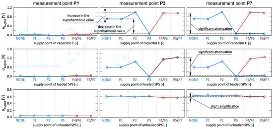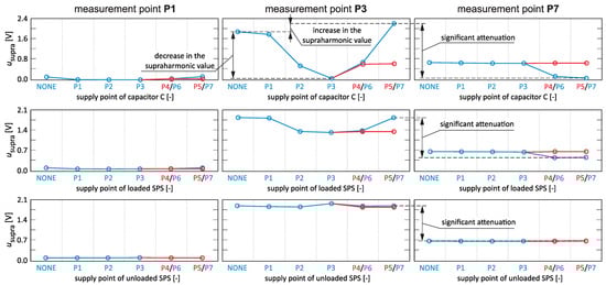 Analyzing the results presented in Figure 12 and Figure 13, it can be concluded that the interaction of two supraharmonic sources with the impedance of supply line is the main cause of problems in the evaluation of the propagation of supraharmonic components in the power grid, and not the interaction with other connected loads. Therefore, analogue research was performed for the case when there is only one dominant source of supraharmonics in the power grid. Figure 14 shows the propagation of the average value of one of the dominant supraharmonics generated by the FEL supplied from the network point P3 at individual points of the network, considering the connection of various types of loads commonly used in the LV network. By analyzing the obtained results, it is also possible to indicate several important problems from the point of view of diagnosing supraharmonics in the power grid, similarly to the case of the occurrence of two significant sources of supraharmonics. Various loads supplied from the same power circuit as the supraharmonic source can cause the supraharmonic values in the network to decrease or increase. Depending on the operating mode of specific loads, there can be significant attenuation (SPS in the loaded mode—Figure 14) or slight amplification (SPS in the idle mode—Figure 14) of the propagation of supraharmonics in the power grid. From the diagnostics point of view, such situations can cause an incorrect indication of the supply point of the source of disturbance. A step change caused by the attenuation of supraharmonic propagation by some load (e.g., capacitor C or loaded SPS) can cause an excessive indication of the number of supraharmonic sources in the power grid (e.g., capacitor C should not be identified as a source of supraharmonics). In turn, a small increase (in the case of a mass impact of loads of a specific type, the increase can be significant) caused by the amplification of the propagation of supraharmonics by a specific load (e.g., unloaded SPS) can result in an incorrect indication of the supply point of source of supraharmonics. Figure 15 shows a comparison of waveforms of phase voltage recorded at measurement points P1, P3, and P7 when the supraharmonics source FEL is supplied from network point P3 and the selected load is supplied from network point P7. The situation shown in Figure 15 shows the possible attenuation or amplification of the propagation of supraharmonics (caused by FEL) by the particular selected loads.