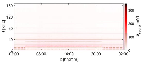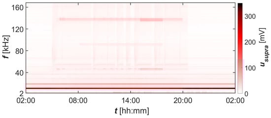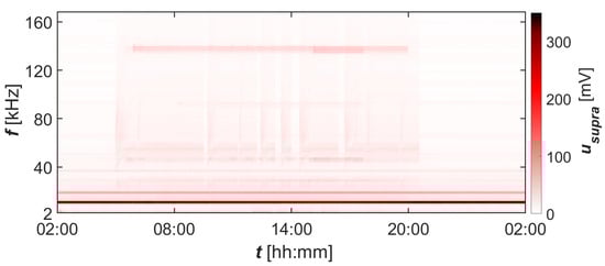 Spectrograms of supraharmonics of phase voltage L1 in the bandwidth 2–170 at network point closer to the MV/LV transformer station—connection point for PV panels.