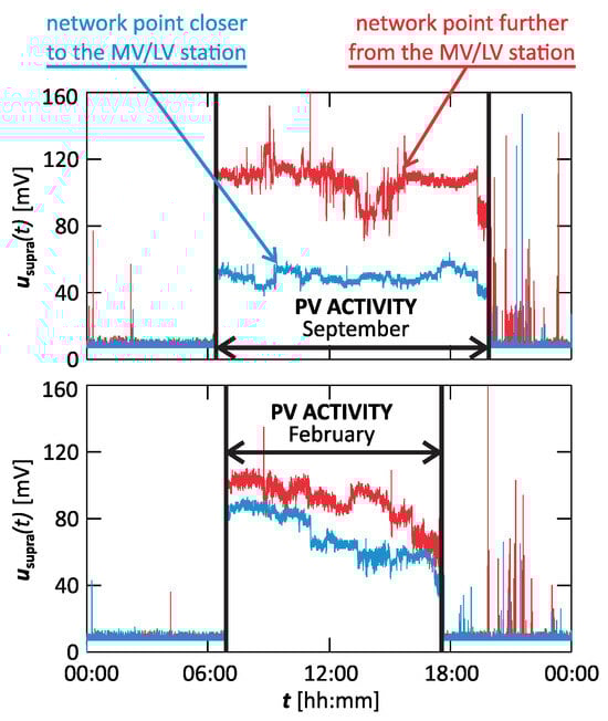 Figure 19, Figure 20 and Figure 21 show supraharmonic spectrograms for subsequent phase voltages at a point further from the MV/LV transformer station. Analyzing the results presented in Figure 16, Figure 17, Figure 18, Figure 19, Figure 20 and Figure 21, a close symmetry between the phases can be noticed at individual network points. It is also worth noting that the local extremes change at particular network points, which is related to the operation of specific loads at particular points in the network. For the purposes of this stage, the focus was on the assessment of components associated with the activity of photovoltaic (PV) panels supplied from a point closer to the MV/LV transformer station. For better analysis, selected supraharmonic components associated with the activity of PV panels are presented in Figure 22 in the form of time characteristics. Taking into account the propagation of supraharmonics discussed in Stage I, dominant supraharmonic values associated with the activity of PV panels at the point of their connection can be expected, and at points further away from the MV/LV station, it can be expected that the selected supraharmonics maintain an approximately similar level. However, based on the results presented in Figure 22, it can be seen that the selected supraharmonics do not maintain a constant value level. Moreover, at the connection point further away from the MV/LV station, there was amplification or attenuation of individual supraharmonics, which can incorrectly indicate that the further network point is the source of the supraharmonics. It is worth noting, however, that many industrial studies performed and repeated confirmed the connection of selected supraharmonics with the power supply point closer to the MV/LV station. The presented studies were carried out on a network with high short-circuit power in order to minimize the impact of other small sources of disturbance. The research carried out herein, some of which is also presented in [36], shows that in circuits with low short-circuit power, the presented problem can be significantly intensified.