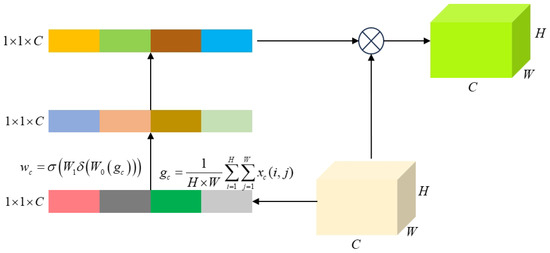 - As shown in Figure 9, the SE module consists of two main components: “squeeze” and “excitation”. First, global average pooling is applied to compress the channel dimension of the input feature map, generating a global feature vector with dimensions . Assuming the input of the c-th channel is x, the global average pooling is computed as . Subsequently, fully connected layers and activation functions are employed to capture inter-channel dependencies and compute attention weights. The attention weight for the c-th channel is defined as , where and denote the Sigmoid and ReLU activation functions, respectively, and and represent the weight matrices of the two fully connected layers. The fully connected layers perform linear transformations on the input data, while the activation functions introduce non-linearity, effectively modeling the semantic dependencies across distant channels. Finally, the attention weights are normalized using a Softmax function and fused with the outputs of the multi-scale feature extraction module through weighted integration, thereby enhancing the representational capacity of the image features.