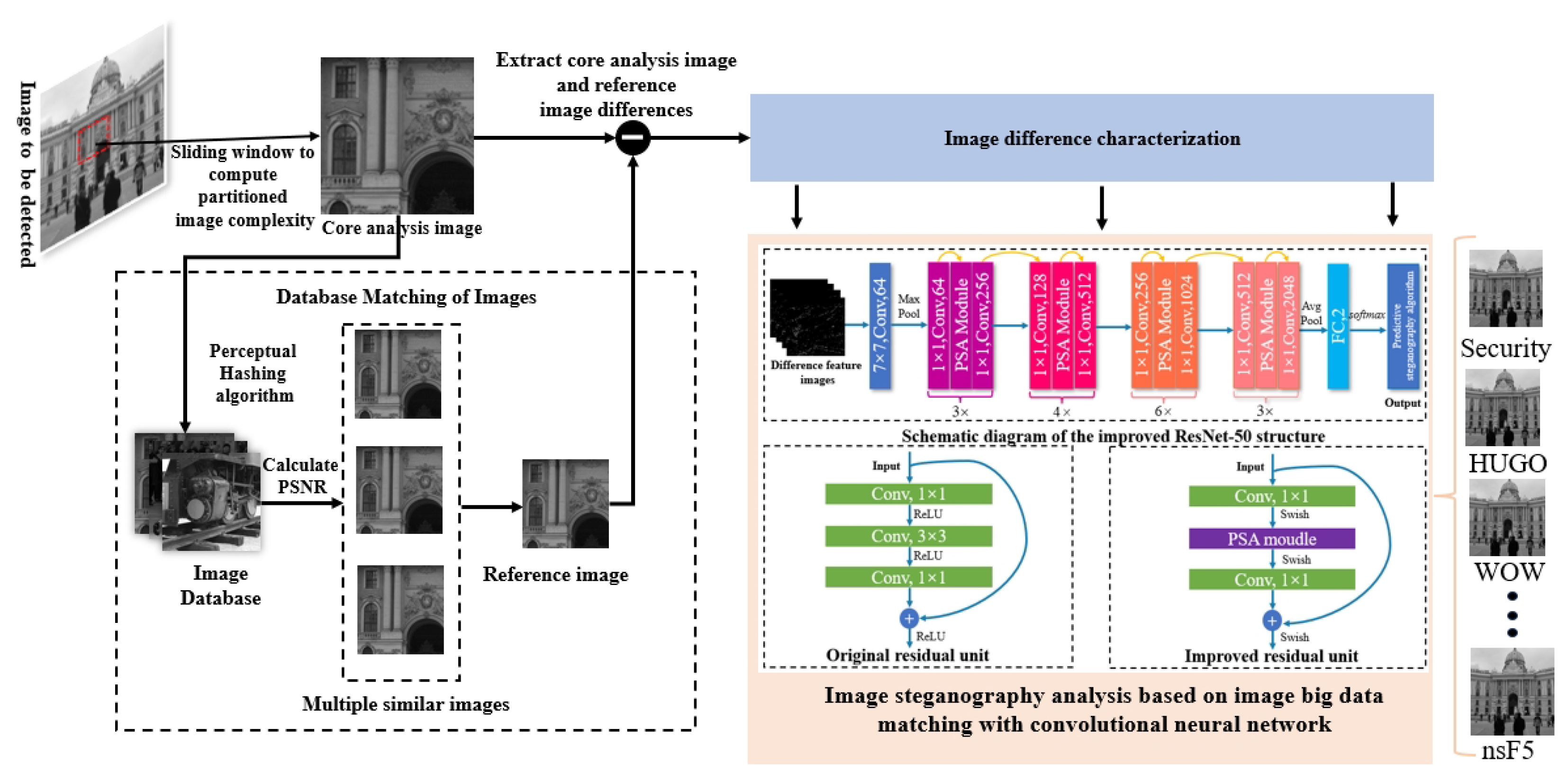 - The steganographic difference feature images are fed into the improved ResNet50-based steganography algorithm recognition model for deep feature extraction and classification. According to the output results of the model, the final judgment is made on whether the image to be detected is a safe image or not. Further, it completes the recognition task of the steganography algorithm.