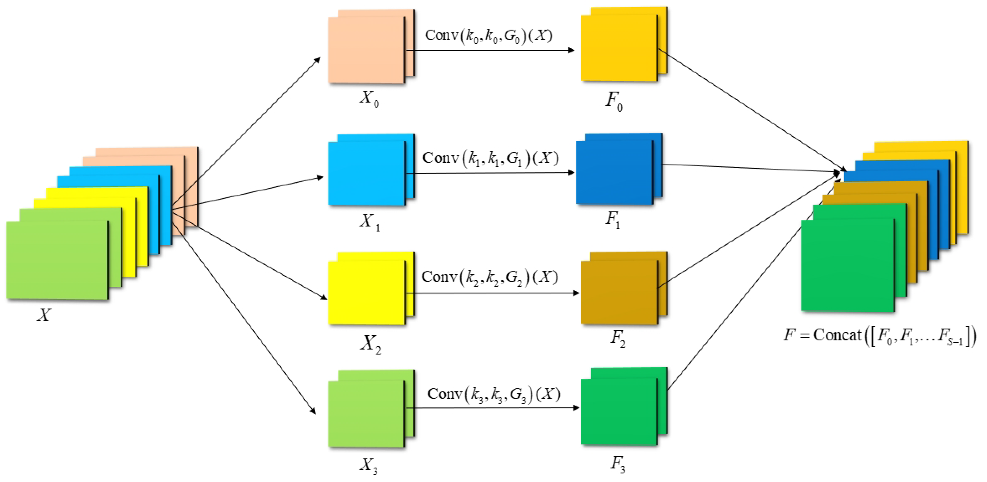 - The computation process of the SPC within the PSA module is illustrated in Figure 8. This module constructs a feature pyramid using multi-scale grouped convolution to extract spatial information across different scales within channel feature maps, generating feature maps with various resolutions and depths. Specifically, the input feature map is first divided along the channel dimension into S parts, denoted as , with each part containing channels. Convolution operations with different kernel sizes are then applied to each part, where the kernel size is determined by . To mitigate the significant increase in computational complexity caused by larger kernel sizes, the SPC module employs grouped convolution for each part, with the number of groups defined as . Multi-scale feature maps are generated for each part using the formula , and these feature maps are concatenated along the channel dimension to form a multi-channel representation enriched with multi-scale information, expressed as . By combining multi-scale grouped convolution and concatenation, the SPC module effectively captures multi-scale spatial features while significantly reducing computational complexity, thereby enhancing the networks ability to model multi-scale features.