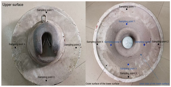 Field insulators operate in complex and unpredictable environments, with each insulator exposed to different natural factors. To refine the assessment of insulator aging and provide more precise aging evaluation recommendations, this experiment considers variations in aging across different positions on the same insulator skirt. This includes differences in aging between various orientations on the same skirt, proximity to or distance from the insulator center, as well as comparisons between the upper and lower surfaces and the internal structure of the skirt. Based on this, each insulator skirt is divided into four equal sections. The section directly below the insulator nameplate is designated as 1, with the remaining sections numbered sequentially in a clockwise direction as 1, 2, 3, and 4, as shown in Figure 5.