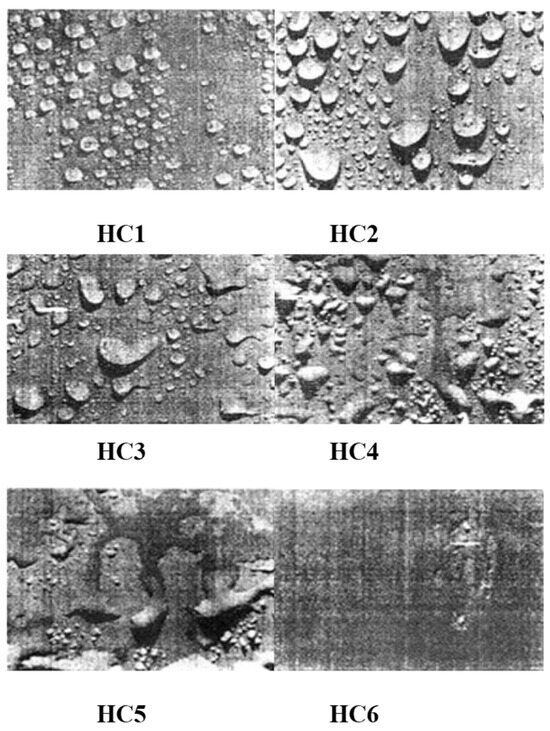 Referring to the standard “DL/T 1474-2015 Measurement Method of Hydrophobicity of Composite Insulators for AC and DC Systems with Nominal Voltage Higher than 1000 V”, the hydrophobicity of the insulator surface was divided into 7 levels, which are expressed as HC1-HC7; the larger the level’s number is, the worse the hydrophobicity is, among which the HC1 level represents the most hydrophobic surface and the HC7 level represents a completely hydrophilic surface. It is generally believed that HC1 and HC2 levels of materials have good hydrophobicity; HC3 level materials show surface aging; HC4 and HC5 material surfaces show more serious aging; HC6 and HC7 levels of material surfaces show complete aging. The specific grading criteria are shown in Table 5 and Figure 6 below.