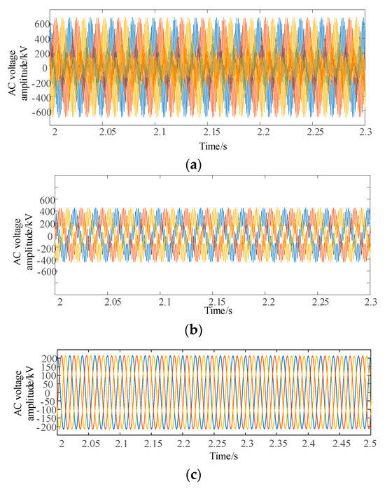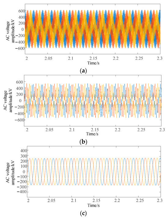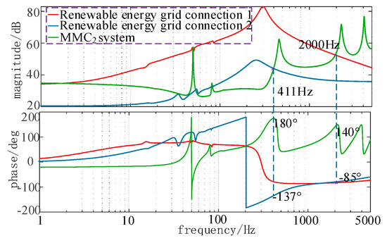 Figure 13, when renewable energy is transmitted through the MMC-HVDC system, oscillations around 2000 Hz occur. After adding a second-order low-pass filter to the voltage feedforward loop, the oscillation phenomenon in the MMC2 system shifts to 400 Hz. However, with the addition of a band-pass filter, the oscillations in the MMC2 system are eliminated.