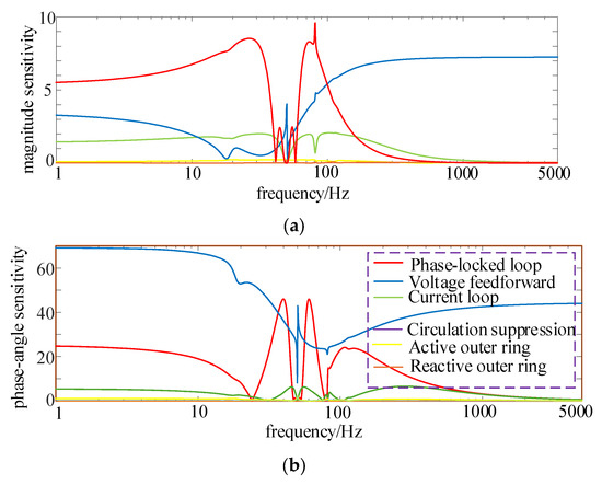Figure 6, the voltage feedforward control has a greater effect on the impedance characteristics in the high-frequency band. The next largest impedance sensitivity is observed in the current inner loop. Across the full frequency range, the impedance sensitivities of the circulating current suppression, active outer loop, and reactive outer loop are relatively small. This indicates that the voltage feedforward coefficient and current inner loop significantly influence the impedance stability of MMC