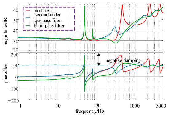 Figure 7 demonstrates that the voltage feedforward with a band-pass filter offers superior damping performance compared to a second-order low-pass filter, highlighting the band-pass filter’s ability to enhance stability margins more effectively. However, while the addition of a band-pass filter to the voltage feedforward loop can alleviate negative damping characteristics in the high-frequency range of the MMC-HVDC sending-end system, it may trigger oscillations in other frequency bands, thereby failing to fully eliminate the negative damping frequency ranges in the system.