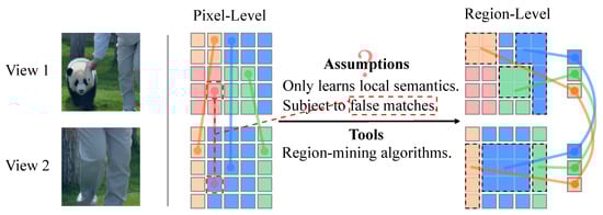 Though image-level learning methods are highly effective when applied on instance-centric images, e.g., ImageNet [20], they are less promising in pre-training with scene-centric images with multiple instances and complex structures [10,11,16,21], such as MS COCO images [22]. To better utilize scene images during the contrastive pre-training of vision foundation models, pixel-level [9,23] and region-level [10,11,12,15,16,17,18,19] methods have been proposed. Pixel-level learning works with individual spatial feature vectors, whereas region-level learning works with selective aggregations of them. To construct positive pairs for pixel-level learning, the semantically closest spatial feature vectors [9] in the two respective views are used. Region-level methods consider this to be insufficient for exploiting complex scene structures and leverage various region-mining algorithms, such as unsupervised object detection [5,7,24,25] or segmentation [8,26], to obtain regions of interest for constructing region-level positive pairs. A conceptual illustration of their positive matching processes is provided in Figure 1.