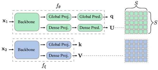 Based on MoCo-v2+, we add another asymmetric prediction structure to the backbone that outputs dense spatial feature maps, or pixel-level (pixels, in this context, refers to spatial components of dense feature maps as opposed to those of the input RGB images) features [10,11,12]. The online encoder now gives two sets of feature vectors, and (after flattening the first two dimensions), where C is the feature dimensionality and S denotes the length and width of the dense feature maps, which are set as equal for simplicity. Similarly, the target encoder gives and . Figure 2 provides a schematic illustration of the forward process. Based on this forward pipeline, we propose different variants of a pixel-level contrastive learning framework, namely, PixCon, with the loss function being