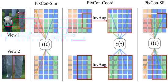 connecting the same positions in the two views’ feature maps aligned by inverse augmentation. By using as the pixel-level loss in Equation (2) and symmetrizing the resulting loss with respect to the two views, we obtain the final loss for PixCon-Coord, i.e., pixel-level contrastive learning with coordinate-based matches.