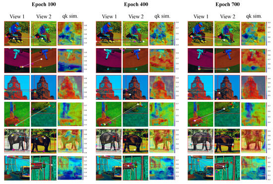 Visualizations of matches with in-box queries but low matching similarities. When formulating the semantic reweighting strategy, we assume that matches with in-box queries, which lie in the intersected area of query and key views, are highly likely to own semantically consistent keys regardless of the query–key similarities, as they are guaranteed to have semantic correspondences in the key view. In Figure 6, we visualize the correspondences between in-box query pixels and their matched key pixels. We can observe that even in an early stage of training, most of the in-box queries with low matching similarities still have semantically consistent key pixels. This validates our assumption that in-box queries tend to have semantically consistent keys regardless of their matching similarities. As training goes further, the matches also get more accurate despite the magnitudes of similarities.