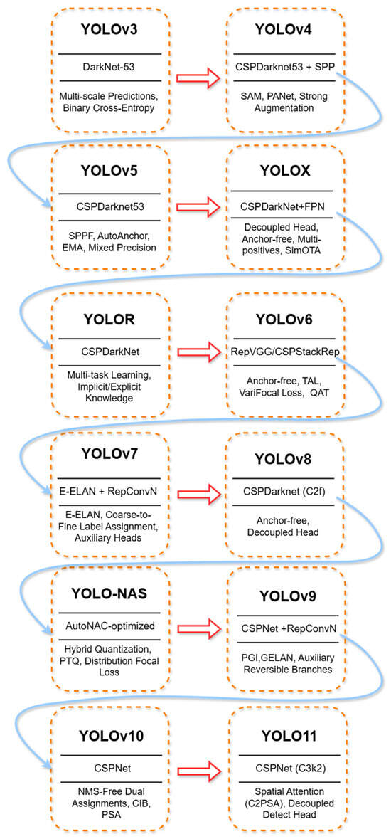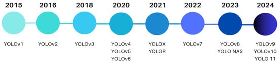 Object detection is a pivotal task in computer vision, integral to a wide range of applications including autonomous vehicles [1], robotics [2], surveillance [3], and various fields like medicine [4] and agriculture [5]. Specifically, YOLO models have been successfully applied in medicine for tasks such as the localization and segmentation of lumbar spine vertebrae deformities [6] and detection of breast lesions [7]. In agriculture, YOLO has been employed for roadside monitoring and the detection of invasive alien plant species [8], as well as the real-time detection of invasive weed seedlings like Solanum rostratum Dunal [9]. Among the numerous algorithms developed for real-time object detection, YOLO (You Only Look Once) stands out due to its exceptional balance between accuracy and speed. Introduced by Redmon et al. [10] in 2015, YOLOv1 marked a significant advancement in the field. Since then, the YOLO algorithm has undergone continuous evolution, with new versions being released almost annually, culminating in the latest iteration, YOLOv11 (Figure 1).