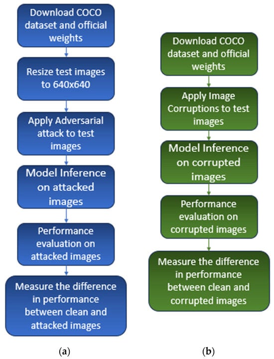 Ensuring the robustness of object detection models is crucial for real-world applications, particularly in safety-critical domains such as autonomous driving and surveillance. This study evaluates the resilience of various YOLO models against adversarial attacks and image corruptions, aiming to identify the most robust architectures. To achieve this, we employed a standardized experimental setup, using the COCO dataset and a diverse selection of YOLO versions ranging from YOLOv3 to YOLOv11, including various model sizes (n, s, m, l, x). These models were selected to cover the full spectrum of advancements in the YOLO framework, from early iterations to the most recent state-of-the-art versions. By leveraging pre-trained weights from official repositories, we ensured that all models were tested in their standard configurations, allowing for a fair comparison. Testing multiple model sizes also provided insight into how architectural complexity influences robustness. Figure 2 shows the pipeline we followed for the experiments and the robustness evaluation. The following sections describe the dataset, attack methodologies, and evaluation metrics used to systematically assess each model’s resilience under different perturbation scenarios.