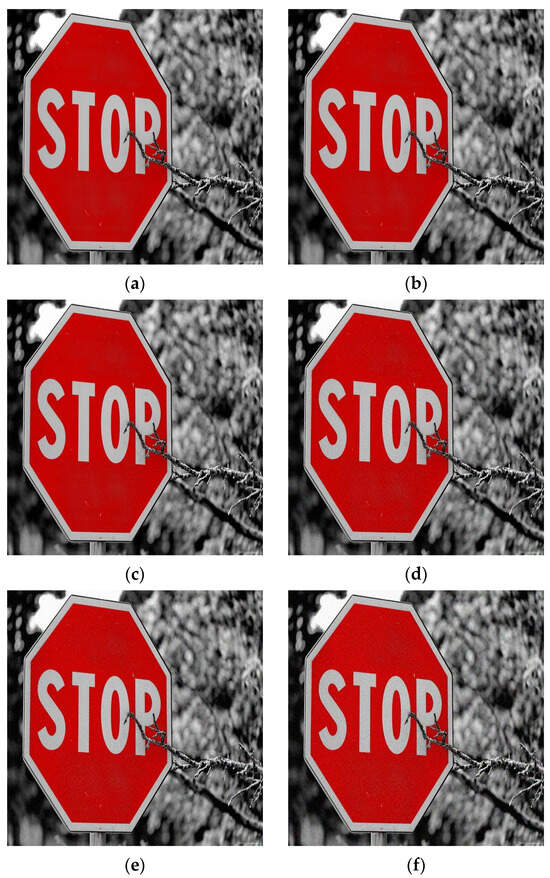 Images under FGSM attack. (a) Clean image, (b) ϵ = 0.01, (c) ϵ = 0.03, (d) ϵ = 0.05, (e) ϵ = 0.07, (f) ϵ = 0.1.