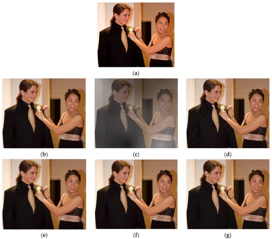 Example of image corruption. (a) Clean image, (b) defocus blur, (c) fog, (d) impulse noise, (e) motion blur, (f) pixelate, and (g) Gaussian noise.
