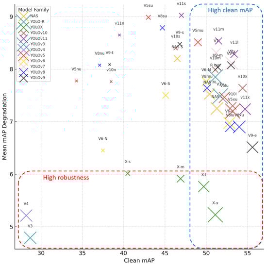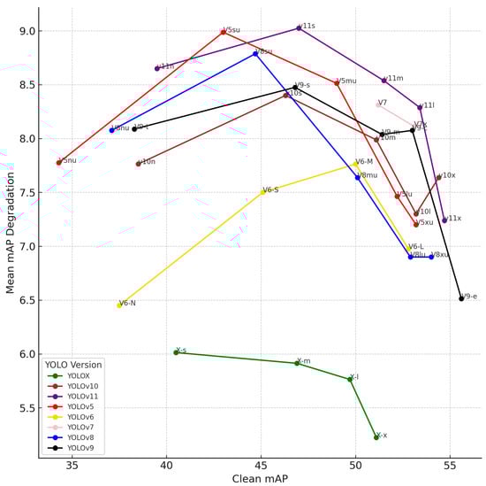 Modern deep neural networks (DNNs) are integral to the success of the aforementioned algorithms. However, numerous studies have shown that DNNs are susceptible to adversarial attacks involving imperceptible perturbations and noisy data [18,19,20]. This vulnerability poses a significant challenge to the deployment of object detectors in real-world conditions, potentially compromising their reliability and effectiveness. Adversarial attacks, which involve adding subtle perturbations to input images, can significantly degrade the performance of deep learning models, leading to incorrect predictions. These attacks exploit the vulnerabilities inherent in deep networks, raising critical concerns about the security of YOLO models in safety-sensitive applications. Alongside adversarial attacks, real-world image corruptions—such as noise, blur, and weather-induced distortions—further impact model performance. As such, robustness to these disruptions is crucial for deploying YOLO models in environments where pristine images are not guaranteed.