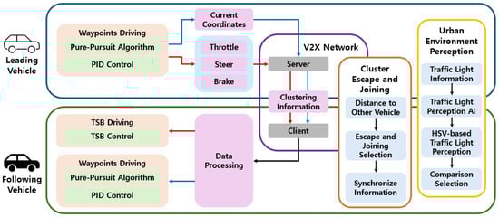 This paper employs the TSB driving method through a V2X network to realize cooperative autonomous driving in an urban environments. For vehicle control, the Pure Pursuit algorithm and PID control technique are applied. In the urban environments setting, traffic lights are detected using the Open Source Computer Vision Library (OpenCV, 4.9.0) with HSV-based color filtering, and pedestrians are recognized through communication with the CARLA server. A central communication server is established within the V2X network, which interacts with the CARLA server. The CARLA server communicates with vehicles via socket programming. Additionally, a cluster escape and joining algorithm is designed, enabling vehicles to dynamically change cooperative driving states in real time. There are five reference terms used for vehicle roles in this study: leading vehicle, following vehicle, preceding vehicle, latter vehicle, and tail vehicle. The leading vehicle is positioned at the front of the cluster, while the tail vehicle is located at the rear. The preceding vehicle refers to the one ahead during an information exchange, transmitting data to the vehicle behind. The latter vehicle is the one behind, receiving data from the preceding vehicle. Vehicles that follow the preceding vehicle and rely on its data are referred to as following vehicles, which include all vehicles in the cluster except for the leading vehicle. The overall architecture of this study is illustrated in Figure 1, and each method is described in detail in the subsequent sections. The red arrows indicate the TSB driving method, the blue arrows represent the waypoints-based driving method, and the black arrows denote the process applied to all vehicles. The colors of the boxes are used solely for visual distinction.