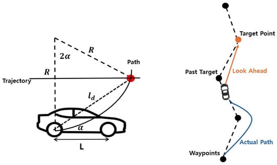 The look ahead path following with the target point and actual vehicle path is illustrated in Figure 2, and the Pure Pursuit algorithm, as expressed in Equation (1), is applied to compute the steering angle [23]. The orange line indicates the look ahead distance between the vehicle and the target point, while the blue line represents the actual driving path of the vehicle. Dashed lines represent reference trajectories based on waypoints, whereas solid lines indicate the actual path traveled by the vehicle. The steering angle is calculated based on the distance to the target point, the wheelbase, and the angle formed with respect to the center of the rear axle. As the vehicle moves, the target point continuously updates, and the steering angle is adjusted accordingly. In this study, the distance between waypoints is set to 1 m, and to ensure stable trajectory tracking, the next waypoint is selected when the distance between the vehicle and the waypoint is less than 2 m. Therefore, the look ahead distance is set to 2 m. The Tesla Model 3, used in the CARLA simulator, has a wheelbase L = 2.85 m. R represents the turning radius of the vehicle, which is the radius of the circular path that the vehicle follows based on its current steering angle. The angle is computed by subtracting the current vehicle yaw from the angle between the vehicle’s current position and the coordinates of the target point. Finally, the derived steering angle is converted into radians and transmitted as the control command .