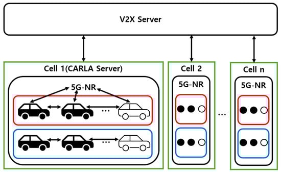 In cooperative autonomous driving system, the accurate management of cluster information is essential due to continuous inter-vehicle communication and the handling of complex requests [25,26]. In this research, the CARLA simulator is considered an edge server operating within a single wireless network cell, reflecting the coverage area of a typical 5G base station. This assumption does not imply the need to deploy a server in every cell but rather serves to model communication delays and cluster control. V2V communication is based on the direct communication method between vehicles and other devices (PC5) interface, while V2I communication conceptually corresponds to the network-based communication method between vehicles and the infrastructure via the cellular base station (Uu) interface. Without implementing the physical layer, the communication is abstractly modeled, and message transmission is secured through Transmission Control Protocol (TCP)-based socket communication. Since the focus of this study lies in evaluating the effectiveness of control strategies rather than precise network implementation, factors such as latency and channel effects are not simulated. The edge server manages the cluster by validating vehicle data and enhances security through pseudonymization, encryption, and digital signatures [27]. The simulation environment is configured under ideal conditions to compare the performance of TSB-based driving and waypoints-based driving. The proposed network architecture is illustrated in Figure 3. The red and blue groups indicate separate vehicle clusters.