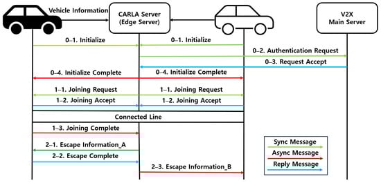 When a vehicle enters a new region managed by a different CARLA server and first connects to the corresponding edge server, its vehicle ID and initial location information are encrypted and transmitted. At this stage, the pseudonymized vehicle ID is inserted into the vehicle ID, front ID, and rear ID fields. The message type is set to “Init”, and the driving information field is padded with zeros. The CARLA server updates and manages vehicle information based on the received packet. Simultaneously, the V2X server obtains the public key corresponding to the actual vehicle ID that is mapped from the pseudonymized ID. Using this key, the vehicle is authenticated through a digital signature. Once authentication is completed, the CARLA server sends an initialization completion message to the vehicle along with waypoints information. The vehicle then begins autonomous driving based on the assigned waypoints and its destination.