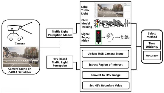 The traffic light perception process is illustrated in Figure 5. This study compares an AI-based method, which utilizes a trained traffic light detection model, with an HSV value-based method and selects the more suitable approach for the urban environments.