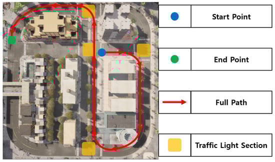 This study is conducted based on TOWN 10 in the CARLA simulator, which features a grid layout, including numerous different junctions including a 4-way yellow-box junction, dedicated turning lanes and central reservations. Traffic lights are installed at all junctions where two or more roads meet, and the driving route is configured to pass through a total of four traffic lights. When the number of pedestrians is set to 10, interactions between vehicles and pedestrians at intersections rarely occur. Conversely, when set to 50, pedestrians continuously cross intersections, causing vehicles to remain stopped. Therefore, the number of pedestrians is set to 25 to allow the vehicle to detect pedestrians at intersections, perform a stop, and resume driving. The entire route, including the departure point, arrival point, and traffic light sections, is illustrated in Figure 6.