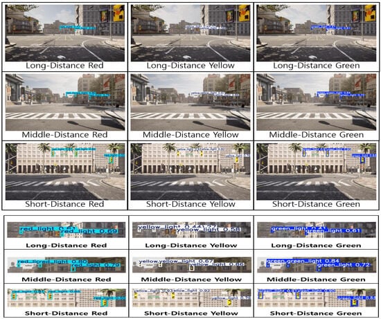 Related research proposes a coarse-to-fine deep learning framework to improve the reliability of existing YOLO-based traffic light perception methods [21]. These existing methods struggle with perception due to the small size and diverse shapes of traffic lights, and they have difficulty distinguishing directional features, such as arrow indicators. To address these challenges, traffic light perception is divided into two stages. In the first stage, YOLOv8-nano is enhanced to detect small traffic lights and to group them into super classes for an initial search. In the second stage, the system accurately classifies traffic light types. It applies depthwise separable convolutions and expansion layers to improve both weight efficiency and accuracy. Super class detection demonstrates better performance than conventional YOLOv5 and YOLOv7, while the second stage achieves higher accuracy with fewer parameters compared to traditional CNN models. As a result, the YOLO-based detection performance is maximized, and the method maintains real-time operation with an average detection speed of 9.9 ms. However, performance still degrades in low-light conditions, and validation remains limited in real-world autonomous driving environments. In this study, a new dataset tailored to the experimental environment is constructed and evaluated in simulated autonomous driving environments.