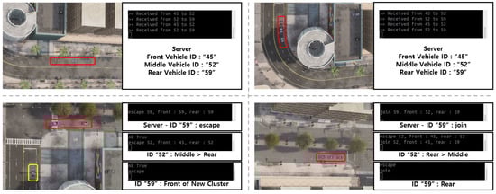 In urban environments, the cluster escape and joining algorithm plays a crucial role [33,34]. Unlike highways, where vehicles maintain continuous movement, vehicles in urban environments frequently stop. Therefore, safe cooperative autonomous driving is feasible only when this algorithm is properly implemented. In this study, the algorithm is designed using each vehicle’s ID and its distance from the preceding vehicle within the V2X network.