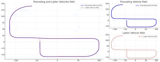 If the ID of the leading vehicle received through the V2X network does not match the ID of the current vehicle, it is classified as a following vehicle. The cluster escape and joining algorithm operates based on the distance to the preceding vehicle. In cooperative autonomous driving, the maximum allowable distance between vehicles in a cluster is set to 30 m. If the distance exceeds this threshold, the vehicle is considered to have escaped from the cluster. In such a case, the system sets to “escape” and designates the vehicle as a new leading vehicle, transitioning it to waypoints-based driving mode. The optimal inter-vehicle distance within a cluster is set to 15 m. If the distance to the preceding vehicle exceeds 15 m but remains below 30 m, the throttle value is increased to close the gap to 15 m. Conversely, if the distance is between 8 m and 15 m, the throttle is reduced to maintain the target spacing. If the preceding vehicle comes to a stop, adjusting the throttle alone may result in a collision. Therefore, if the distance to the preceding vehicle falls below 8 m, the brake is applied to bring the vehicle to a complete stop. As the following vehicles also stop sequentially, this mechanism prevents collisions even when the current vehicle remains stationary.