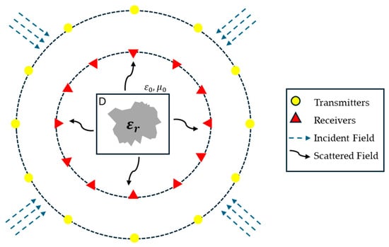 Figure 1 illustrates a typical microwave imaging setup for inverse scattering problems. The diagram consists of transmitters (yellow circles) and receivers (red triangles) arranged in a circular configuration around an unknown dielectric target, represented by inside the domain . Transmitters emit electromagnetic waves (yellow curved arrows) toward the imaging region. These waves interact with the unknown object inside , which has a relative permittivity and is surrounded by a free-space medium with permittivity and permeability . As the waves scatter upon encountering the target, receivers capture the scattered field (red arrows), which contains crucial information about the object’s shape, location, and material properties. The collected scattered field data is then used in an inverse reconstruction algorithm, such as BP or the DSM, to estimate the dielectric distribution of the target.