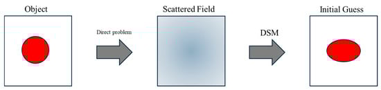 The DSM is a simple, fast, and efficient non-iterative sampling technique. Since it only requires input from the scattered field data, it can rapidly reconstruct an initial estimate of the location and size of the target. In this study, for reconstructing surface profiles and conductor shapes, DSM is particularly suitable for retrieving the shape and position of unknown scatterers, as conductors only require shape and size reconstruction. A schematic diagram of this process is shown in Figure 2.
