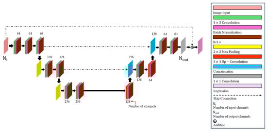 In the expanding network, an up-sampling operation is applied to the upper convolution layer to restore spatial resolution. The convolution layers extract features using multiple filters, while batch normalization accelerates training and stabilizes gradient updates by reducing sensitivity to parameter variations. ReLU layers introduce nonlinearity, allowing the model to recognize complex patterns and enhance decision-making. Although this process improves model performance during training, its immediate effects may not always be evident. Here, represents the number of input channels, and represents the number of output channels. In this study, is equal to . In the final stage, a convolution layer with size consolidates the extracted features to produce predictions. The key reasons for choosing U-Net are its strong generalization capability, skip connections for gradient stability, and an enhanced receptive field and prediction accuracy.