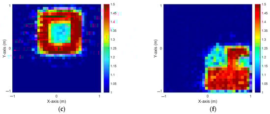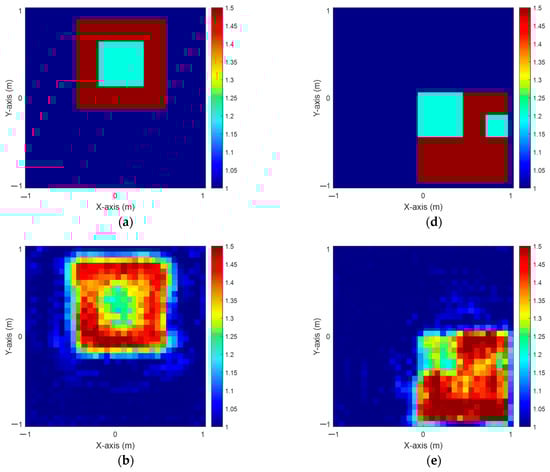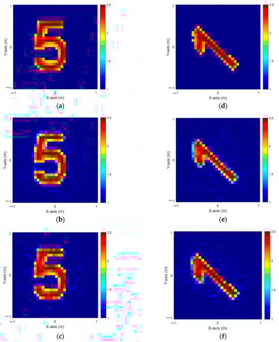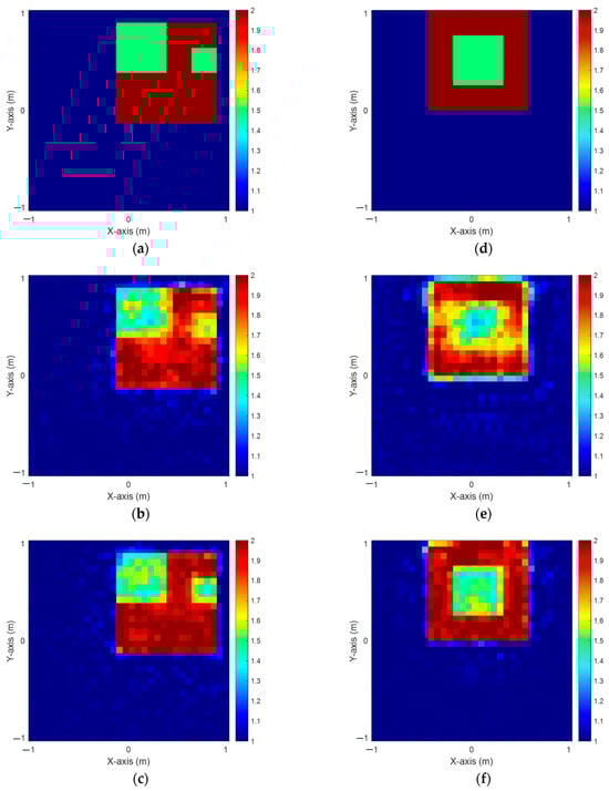 This scenario involves the permittivity distribution ranges between 1.5 and 2 with 5% Gaussian noise. The dataset remains at 500 (10 50) images as in the previous case. The BP and BP-DSM mechanisms are used to reconstruct dielectric objects in both TM and TE wave conditions. Figure 5a represents the true . Figure 5b illustrates the reconstructed by the BP scheme. Figure 5c depicts the reconstructed by the hybrid BP-DSM scheme. Figure 5d represents the true . Figure 5e presents the reconstructed by the BP scheme. Figure 5f shows the reconstructed by the BP-DSM mechanism. By comparing Figure 5b,c, as well as Figure 5e,f, it is clear that the BP-DSM mechanism markedly improves reconstruction quality and enhances the accuracy of both the object’s shape and its permittivity distribution, outperforming the BP scheme used alone.