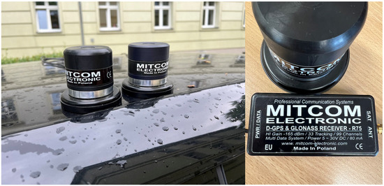 Mitcom GPS receivers mounted on the roof of a vehicle. The devices are placed close to each other and secured using magnetic bases. The experiment was conducted in outdoor conditions, as indicated by the raindrops on the car’s surface (left). A close-up view of one receiver along with its control module. The label on the module indicates its specifications, including D-GPS and GLONASS support, high-gain sensitivity of −165 dBm, 33 tracking channels, and 99 channels in total. It also operates with a multi-data system and requires a 5–30 V DC power supply at 80 mA (right).