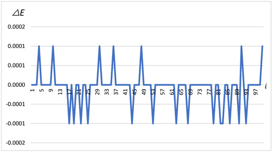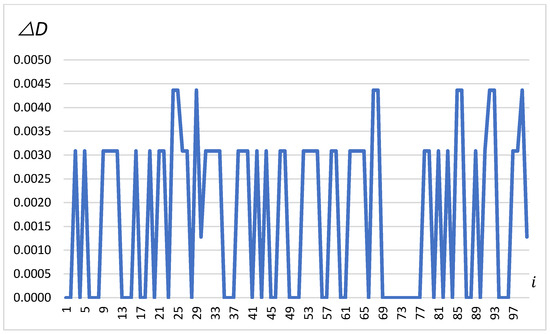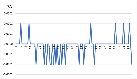 The chart in Figure 4 shows changes in , which are differences in latitude measured in minutes for a series of 100 measurements. These changes oscillate between −0.0001 and 0.0001 min, indicating minor positional corrections as the vehicle moves. The figure illustrates irregular but repeatable jumps in value, which may indicate corrections by the GNSS system in response to dynamic environmental conditions affecting measurement accuracy. The oscillation patterns suggest that the vehicle was subjected to continuous, minor positional adjustments during the experiment.