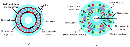 - Bai, J.; Liu, J.; Zheng, P.; Tong, C. Design and analysis of a magnetic-field modulated brushless double-rotor machine—Part i: Pole pair combination of stator, pm rotor and magnetic blocks. IEEE Trans. Ind. Electron. 2019, 66, 2540–2549. [Google Scholar] [CrossRef]
