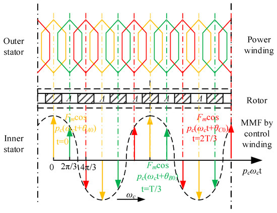 - Liu, H.; Zhang, Y.; Zhang, F.; Jin, S.; Zhang, H.; Nian, H. Design and performance analysis of dual-stator brushless doubly-fed machine with cage-barrier rotor. IEEE Trans. Energy Conver. 2019, 34, 1347–1357. [Google Scholar] [CrossRef]