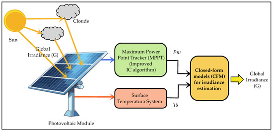 On the other hand, to maximize the use of solar energy, PV systems must operate under optimal conditions. According to the authors of [11], one of the main parameters to evaluate their performance is efficiency, defined as the ratio between the power generated and the product of the panel area and the incident irradiance. While power and module area are easily measurable parameters, determining irradiance can be challenging in remote areas due to costs and difficulties in accessing suitable sensors. In this context, several approaches have been developed to estimate irradiance using the PV modules themselves, taking advantage of voltage–current (V-I) operating point and surface temperature measurements, which are used in closed-form models (CFMs) for predicting the electrical behavior of modules under different environmental conditions.
