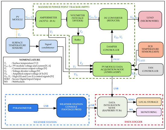 Figure 2 presents a block diagram detailing the overall system’s operation, divided into three subsystems. The first subsystem corresponds to the MPPT system, controlled by an ATMEGA328P microcontroller (Manufacturer: Microchip Technology Inc.; City: Chandler; State: AZ; Country: USA), which is responsible for acquiring the current and voltage signals to adjust the duty cycle of the DC-DC converter using PWM signals. This control is carried out through a gate driver for MOSFET transistors. This microcontroller also collects the PV module’s surface temperature and the board’s temperature, which is designed to ventilate the switching circuits due to the heat generated by the continuous power dissipation at the converter’s final load. The second subsystem is a Davis Instruments weather station, model Vantage Pro 2 (Manufacturer: Davis Instruments Corporation; City: Hayward; State: CA; Country: USA), which provides global reference irradiance measurements obtained through its console’s USB serial port. Then, the data obtained by this subsystem and the data from the ATMEGA328P microcontroller are integrated into a central processing node. Finally, the third subsystem is the data logger, which is responsible for recording, storing, and analyzing irradiance estimates to evaluate the proposed system’s performance.