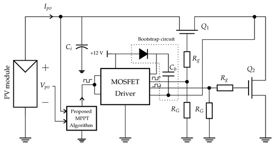 The MPPT system is composed of a DC-DC converter, an MPPT algorithm, and a controller for the MOSFET driver, as shown in Figure 3. The PV module is modeled by a single-diode equivalent circuit, which includes a current source, a shunt resistor, and a series resistor.