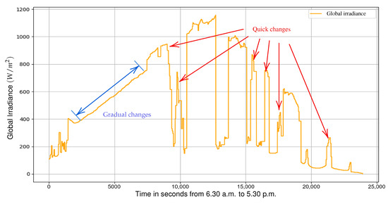 For the current and voltage feedback, as shown in Figure 4, an ACS712-20A module and a voltage divider were used, respectively. Both were calibrated and compared with a Fluke 287 multimeter, with a large set of data collected in parallel to ensure the reliability of the MPP measurements and, consequently, guarantee the proper functioning of the proposed algorithm. The proposed algorithm incorporates an additional implementation in which the step size () dynamically varies from a higher value to a lower one, progressively over time intervals in seconds, on top of the IC algorithm. Two changes in irradiance levels due to the speed of cloud movement in the atmospheric sky have been identified: gradual and rapid changes, as shown in Figure 5. Due to this, a detector is implemented that measures the magnitude of the changes in terms of power, voltage, and current variations, which are integrated into a single variable. Likewise, the MPPT IC algorithm proposed is based on [20]. It does not include MPPT under partial shading conditions because the adequate area dimensions of the PV modules are relatively small, approximately 0.5 m2.