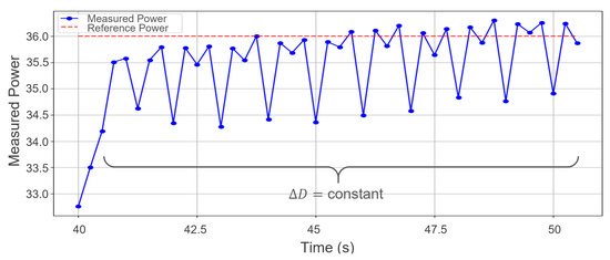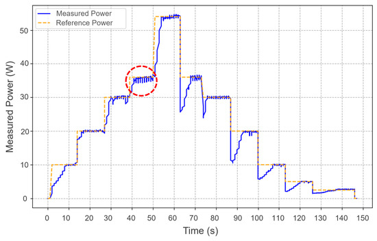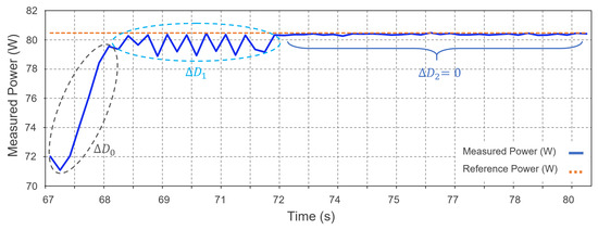 The typical oscillations of this IC algorithm are observed in Figure 7 for a period between 40 and 50 s at 36 W input power reference from Figure 6 (red circle) for a constant . Therefore, to control and stabilize these oscillations, the millis() function of Arduino was used to assign different values of with a total duration shorter than the time it takes for the traditional IC algorithm to reach the MPP. In this case, the Arduino microcontroller achieved this within 4 to 5 s.