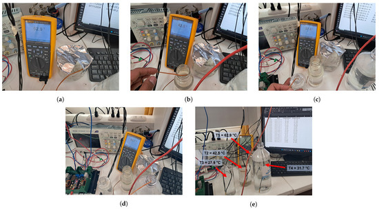 Figure 14 shows the verification of the temperature measurement system. Four plastic containers with water at different temperatures were used, as shown in Figure 14a–d. So, the system calculates the final temperature as the average of the measurements in these four containers. Therefore, the results of measuring the temperatures in these vessels with the K-type thermocouple coupled to a Fluke 287 multimeter demonstrate the system’s accuracy. The results confirm the correct functioning of the averaging system, as the final reading recorded by the system was 41.25 °C. Finally, Figure 14e shows the values recorded by the system, which vary between 41 °C and 42.5 °C, validating the accuracy of the average temperature estimation.