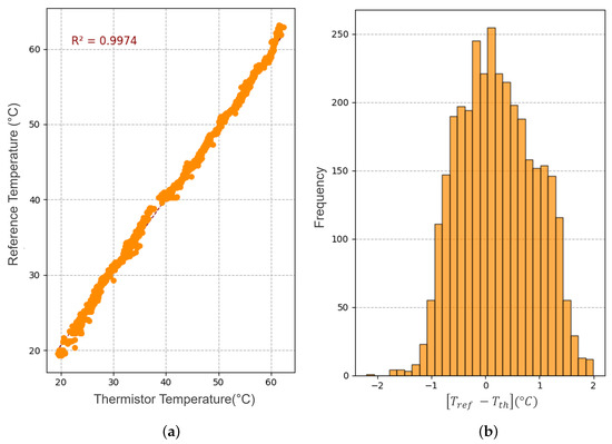 Figure 15 shows the evaluation of the measurement system by means of a temperature sweep from 20 to 63 °C, using four thermistors immersed in the same water tank. The results show a variability of ±2 °C in the readings, while the correlation with the reference values reaches a coefficient of 0.9974, indicating a strong relationship between the two measurements. This test establishes the correlation between the thermistor readings and the reference values and analyzes the variability of the measurements using a histogram.