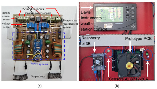 Figure 16a shows the installation of an additional PV module aligned in the same tilt plane as the Davis Instruments pyranometer. Figure 16b shows the placement of the thermistors on the back of the modules with aluminum tape to have a good approximation of the internal temperature of the modules based on [40]. On the other hand, Figure 17a shows the implementation of the designed circuits, including the MPPT system and the temperature measurement system, on a single double-layer PCB board. Figure 17b shows the prototype installed inside a cabinet together with the other elements necessary for data acquisition and acquisition.