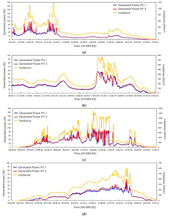 The pattern of maximum irradiance and power generated by the PV modules. (a) Profiles of 20 November—day 1. (b) Profiles of 21 November—day 2. (c) Profiles of 22 November—day 3. (d) Profiles of 23 November—day 4.