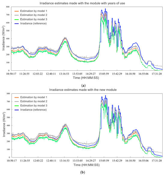 Comparison between the estimates using the CFMs and the pyranometer sensing. (a) Comparison in the PV module with years of use. (b) Comparison in the new PV module.