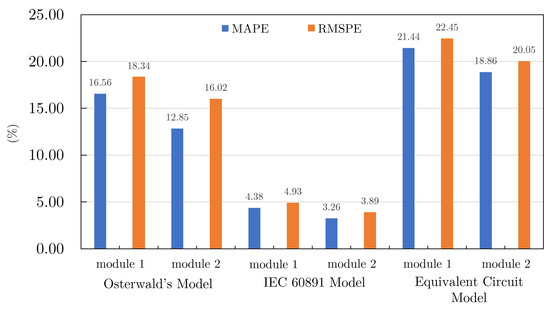 On the other hand, Figure 20 shows the results of the MAPE and RMSPE calculations for each model and photovoltaic (PV) module. Furthermore, the model is based on the IEC equations, showing the highest accuracy (errors < 5%), while the equivalent circuit model presents the highest uncertainty (errors > 20%), followed by the Osterwald model. We can also observe that the estimates are more accurate for module 2 (new) than module 1 (used), suggesting degradation due to aging. Based on these results, the IEC model is the most recommendable for daily analysis, incorporating the bias to determine possible over or underestimates.